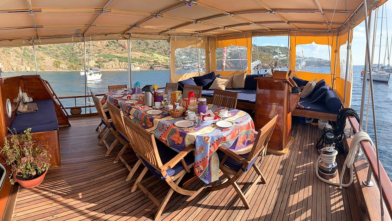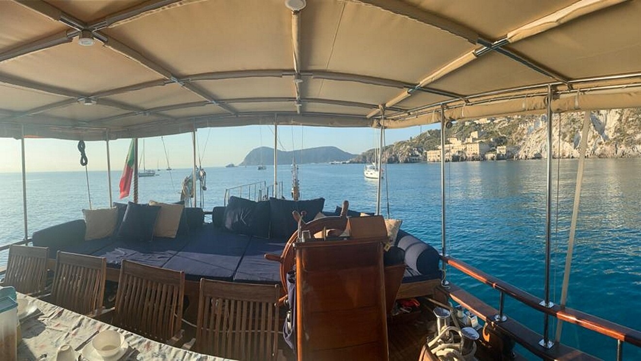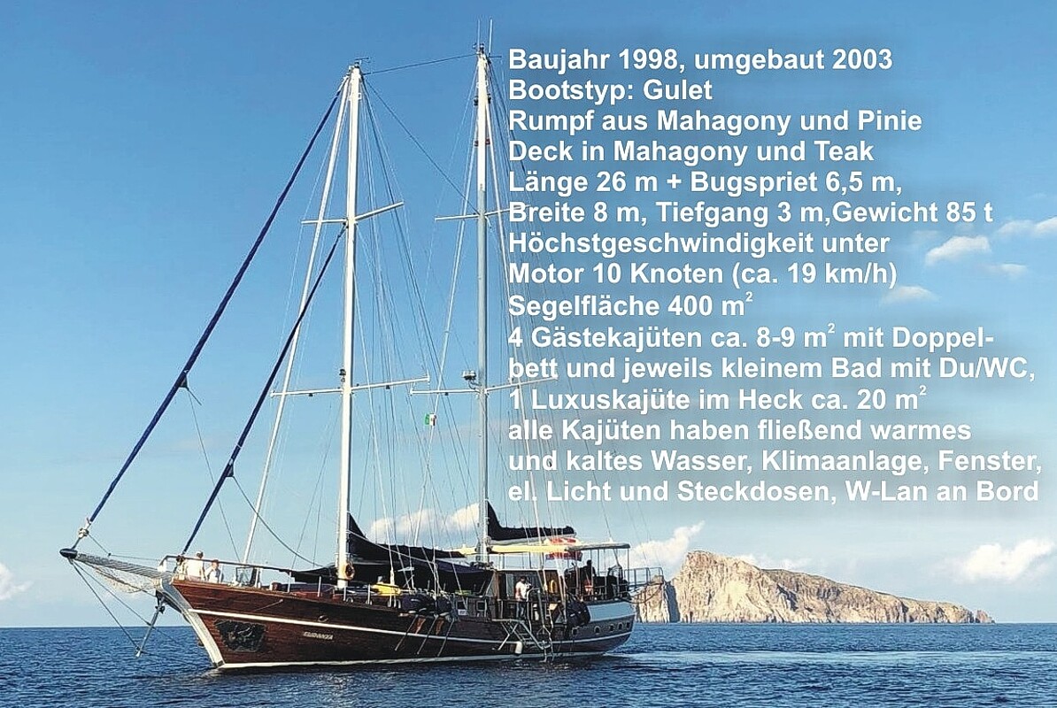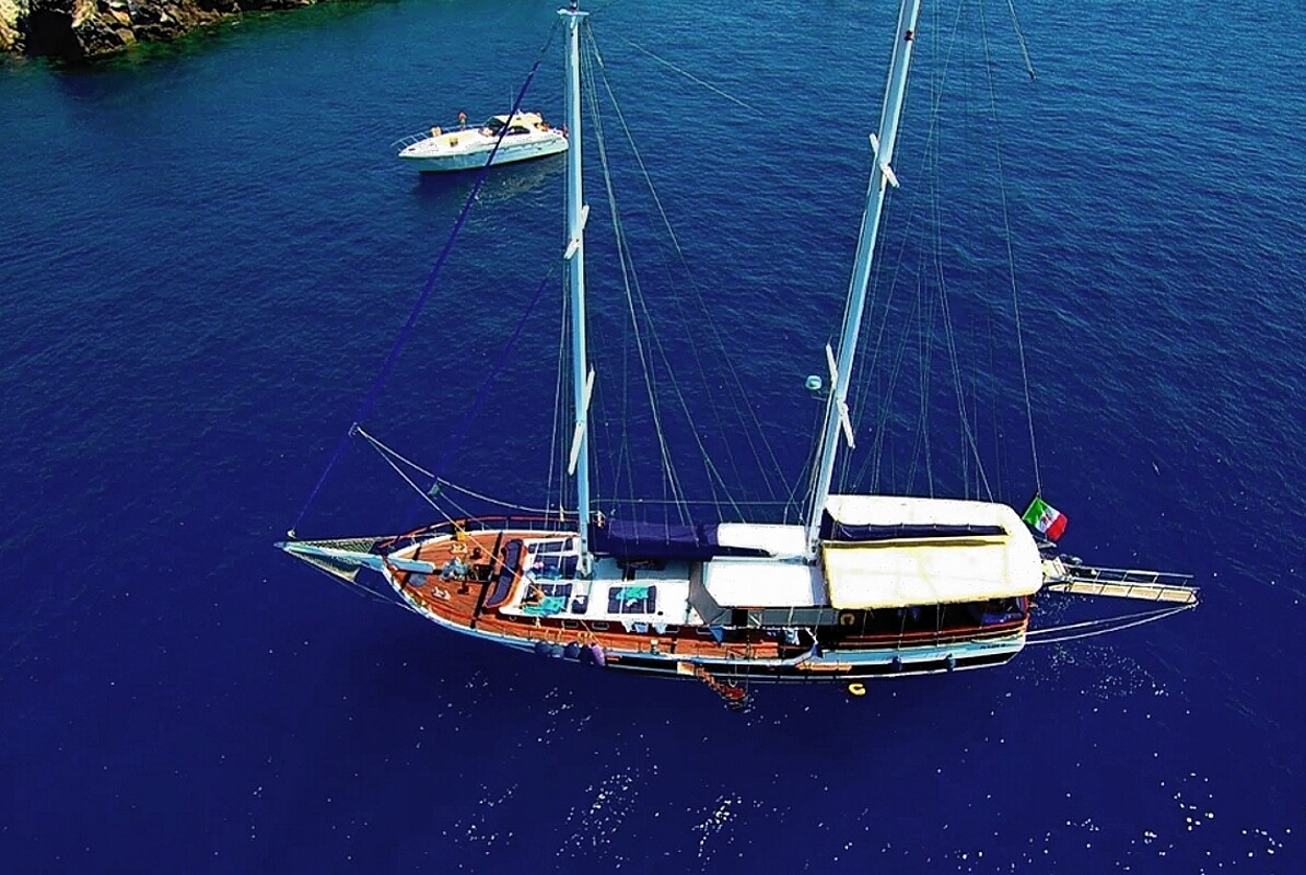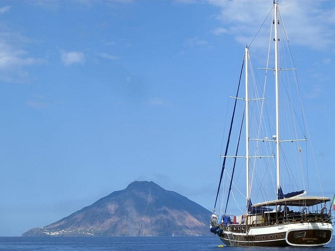 unsere Motorsegelyacht bei einem Badestopp vor Stromboli