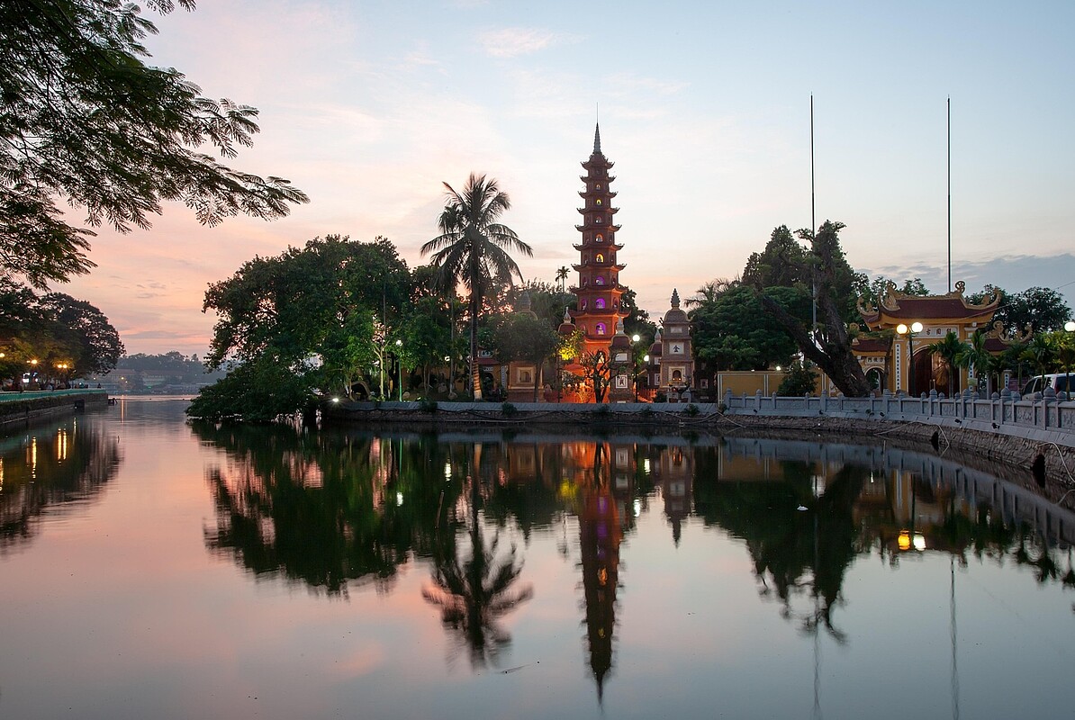 Ganztägige Stadtexkursion in Hanoi: zu den Höhepunkten zählen dabei - neben dem Literaturtempel - u.a. der Jadeberg-Tempel am See des Zurückgegebenen Schwertes, die Zitadelle, das Wohnhaus von Ho Chi Minh, das Ho Chi Minh Mausoleum (nur Außenbesichtigung) sowie die Ein-Pfahl-Pagode, die Tran Quoc-Pagode und die Long Hung Pagode sowie ggf. den Viet Phu Thanh Chuong-Palast.