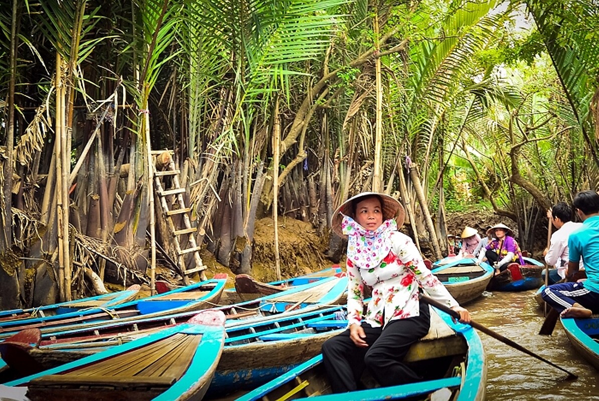 Am frühen Morgen Fahrt nach My Tho im fruchtbaren Mekong-Delta. Nach einer Bootsfahrt auf einem Mündungsarm des Mekongs mit verschiedenen Zwischenhalten (Ziegelsteinherstellung in Handarbeit, Kokospresse, Herstellung von Strohmatten) gemütliches Mittagessen (inklusive) in einem Restaurant inmitten der intensiv durch Landwirtschaft genutzten Flusslandschaft. Neben Flussgarnelen wird im Restaurant auch Elefantenohrfisch serviert. Nach einer Sampan-Fahrt am Nachmittag durch enge Kanäle der Mangrove Rückfahrt mit dem Bus nach Saigon. Das Abendessen ist heute individuell (nicht im Exkursionspreis enthalten), sodass jeder die Möglichkeit hat, nach eigenen Plänen den Abend zu gestalten.