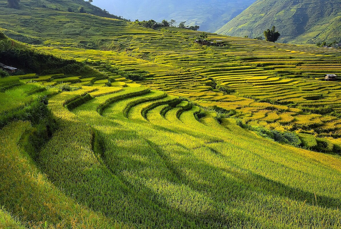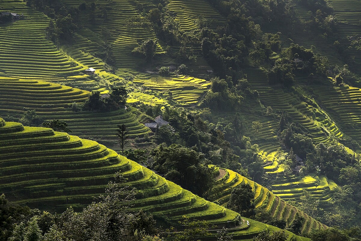 Nach dem Frühstück und dem Check-out im Hotel führt uns die Fahrt durch das Gebirgsland zunächst wieder bis zum O Quy Ho-Pass, danach entlang der Westflanke des Hoàng-Liên-Sợn-Gebirges durch die schönsten Reisterrassen Vietnams nach Mu Cang Chai. Auf dem Weg entlang einer landschaftlich spannenden Strecke über den Gebirgspass in Mu Cang Chai (1550 m) passieren wir Hmong-, La Ha- und Dzao-Bergdörfer. Die Aussichten von den Hängen des tief eingeschnittenen Flusstals suchen ihresgleichen, weshalb wir hier auch einen Spaziergang durch die spektakuläre Landschaft mit über 500 ha Reisterrassen unternehmen. Auf der Weiterfahrt Richtung Yen Bai erreichen wir das Tu Le Charm Resort mit seiner eigenen heißen Quelle, wo wir auch übernachten werden.