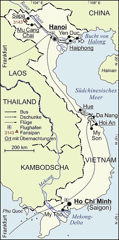 ■ Der auffällig geradlinige Verlauf des Roten Flusses zeichnet deutlich eine tektonische Naht zwischen zwei kleinen Kontinentblöcken nach. Nordöstlich dieser Linie befindet man sich auf dem Südchina-Block, während man sich südwestlich von ihr auf dem Indochina-Block befindet. Beides sind Bruchstücke des alten Südkontinents Gondwana (mit Afrika, Südamerika, Antarktis, Australien und Indien als dessen größte Bruchstücke), die vor rund 350 Mio. Jahren von Gondwana abbrachen, nach Nordosten drifteten und an den asiatischen Nordkontinent angeschweißt wurden. Die Gebirgsregion um den Fansipan (mit 3143 m höchster Berg Vietnams) hat deshalb, neben der rauen Schönheit der Landschaft, auch geologisch so einiges zu bieten. Sie ist aber auch die kälteste Region des Landes. Besonders im Winter (Dezember bis Februar) ist warme Kleidung notwendig, die man wegen der Temperaturen in Deutschland zu dieser Jahreszeit eh dabei hat. Die warme Jacke, die man dem Weg zum Flughafen benötigt, ist damit nicht umsonst während der restlichen Reise im Gepäck.
